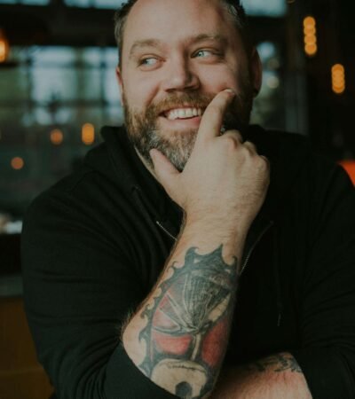 A luxury white villa with large windows and a green roof is situated on a scenic hillside. A man in sunglasses and swimwear is casually seated on a wooden railing, enjoying the warm sun.